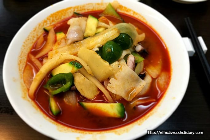이번주면 사실상 프로젝트가 종료되어 철수만 남은 상태라 한가로운 시간을 보내고 있는데 매일 점심 시간이면 메뉴 선정때문에 고민 아닌 고민을 하게 된다. 일전에 프로젝트룸 근처 중식당이 있어 갔다가 삼선짬뽕을 주문했는데 너무 엉망이었다. 재료도 싱싱해 보이지 않았고 오래된 오징어(빛깔이 까맣다)도 들어 있고 전혀 개운하지 않은 국물도 그렇고 해서 이번엔 좀 더 멀리 걸어 나갔다.