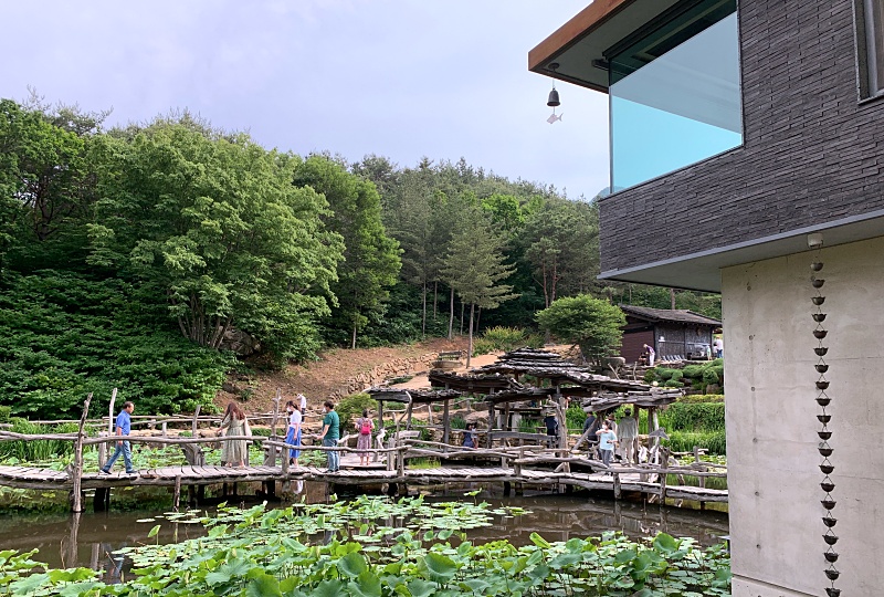 연못에는 울퉁불퉁한 나무로 만든 다리가 놓여져 있어 연꽃을 구경하며 돌아볼 수 있도록 조성되어 있고 사찰을 마주보고 우측에는 현대식 카페 건물이 있다.