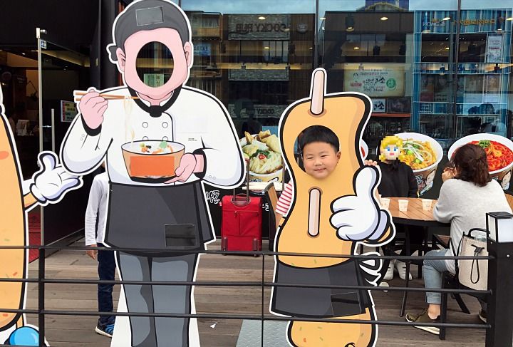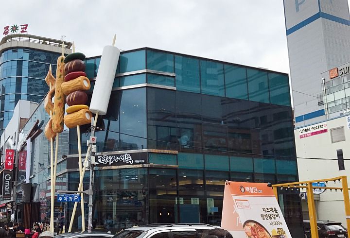 역에서 나오자 마자 50m도 안되 엄청난 크기의 어묵 꼬치가 몇 개 서 있는데 그 집이 바로 어묵으로 유명한 고래사어묵이라고 하네요. 우선 배가 출출하니 어묵하나 먹자고 해서 야외 테라스에 자리 잡고 앉았습니다. ㅎ ~