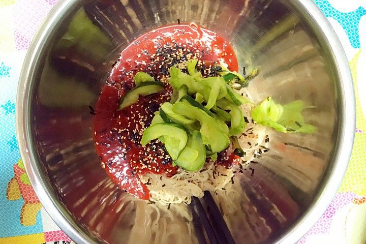 빨간 양념장 소스가 풍미를 더해주고 초까지 계산해서 삶은 면은 아주 적당히 잘 익었다. 낮부터 메뉴얼을 찾아 만든 오이저림. 만약 저 저림이 없었다면 맛이 없었을 비빔냉면, 고명은 꼭 있어야 한다.